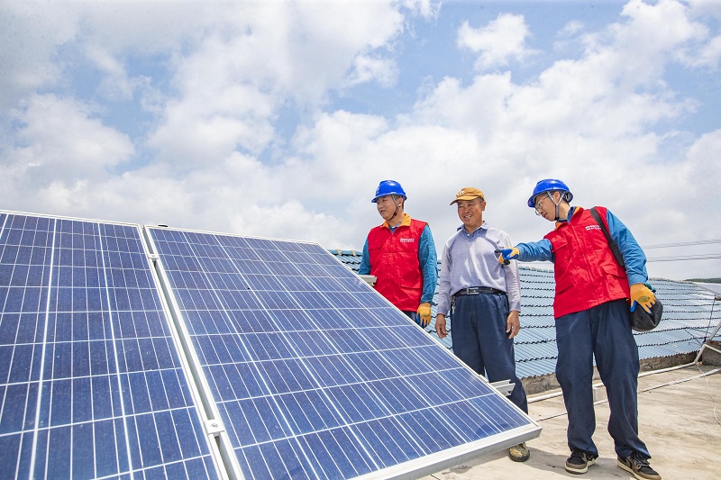 国家电网山东电力共产党员服务队队员在陈疃镇卞家庄村帮助客户检查光伏设备。