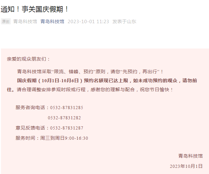为包管旅客参观体验,熊猫谷景区实行全网实名预约分时限流入园。因假期人流量较大,截止发稿时,10月2日、10月3日、10月4日全天门票已售罄,10月5日上午场次另有少量余票。成都动物园于2023年9月29日——10月6日中秋、国庆节沐日时代,实行线上预约、限流入园办法。线上购票渠道可提前3天预约,并按预定日期直接刷身份证或购票..入园。旅客可经由“成都动物园”微信公家号下方菜单栏在线购票,也可经由支出宝、微信搜刮“成都动物园电子票”小法式,或许在各大电子..上购票,按照购票页面把持流程和提醒进行预约购票。截止今朝,秦陵博物院10月1日—4日门票已售罄,后续日期还有少量余票。已经预约门票的观众,为了您获得较好的参观游览体验请务必按照预约时段前来参观。已购票预约观众如行程有变,请实时退票,匡助我们提高门票使用效率。青岛科技馆接纳“限流、错峰、预约”原则,请您“先预约,再出行”!国庆假期(10月1日-10月6日)预约名额现已达上限,如未成功预约的观众,请勿前去。今日(10月2日),仰口、九水游览区全天门票预约已达上限。没有成功预约的旅客,请勿前去。请您实时调整预约时段或行程,介绍预约南线太清游览区。感激您的懂得与合营。截止今朝,10月1日全天门票及10月2日-10月4日的夜间门票预约量均已达到限量阈值并暂停相关时段的线上线下售票。为确保中秋国庆沐日秩序平安、有序,景区从严落实“限量、预约、错峰”办法,现将有关事宜公告如下:1.无预约,不出行。泰庙门票可提前14天预约,请及早登录“泰山景区”微信公家号“微信购票”栏目实名制预约。请不要在其他..预约门票,以免造成无法入园和产业损失。未完成预约的,请勿前去各旅客中心,以免延迟行程。2.核身份,严检验。景区实行最严厉的门票预约检验轨制,一一核验旅客本人的身份信息和预约订单,信息相符方能检票入园。请务必在预约的时段、预约的进山口入园,不然将造成检票失败,须按原购票渠道退票后从新预约。3.触红线,追责任。对景区接纳的平安提防和应急措置办法不予合营的,将被纳入旅客不文明行为记录,需要时向有关部门传递。骚动民众场合秩序等违法行为人,或被穷究司法责任。