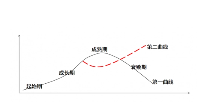 当“第一曲线”滑过S曲线的极限点(S曲线的最高点)就会衰退,而企业持续增进的机要,就是在第一条曲线衰落之前起头一条新的S曲线,这就是第二曲线。