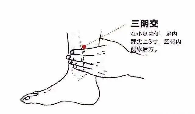 三阴交:手四指并拢,小指下缘紧靠内踝尖,食指上缘地点水平线与胫骨后缘的交点,按压有酸胀感处即为此穴。
