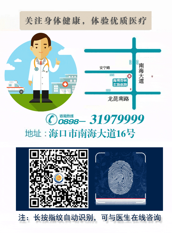若是您有“痔疮、脱肛、肛瘘、肛裂、肠炎、肠息肉、胃息肉、胃胀、反酸、烧心、口吃力、口臭、嗳气、腹泻、便秘、便血”等不适症状应实时进行搜检,早发现,早诊断,早治疗。咨询热线:0898-31979999。